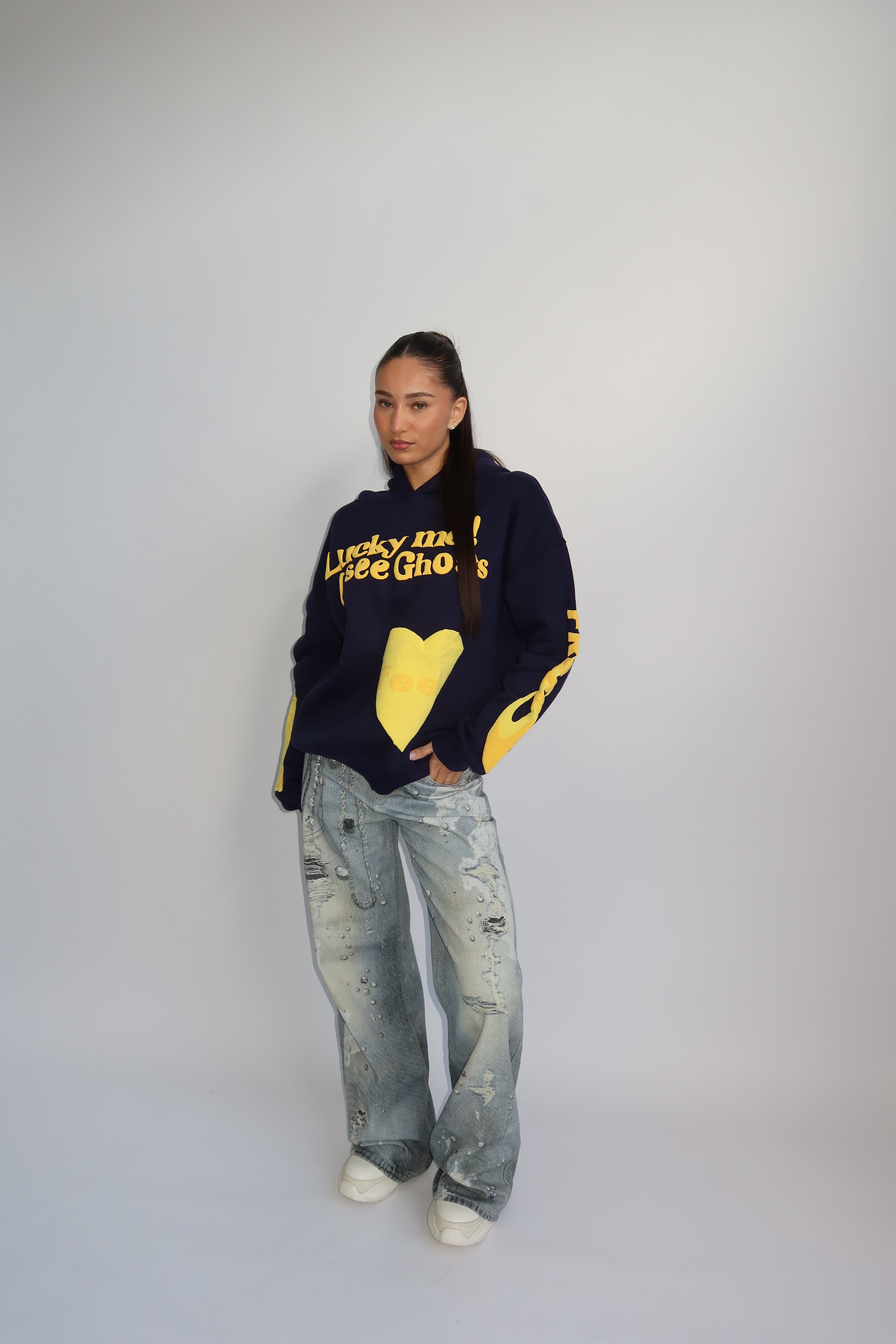 AW25 – LUCKY ME HOODIE – NAVY WITH YELLOW